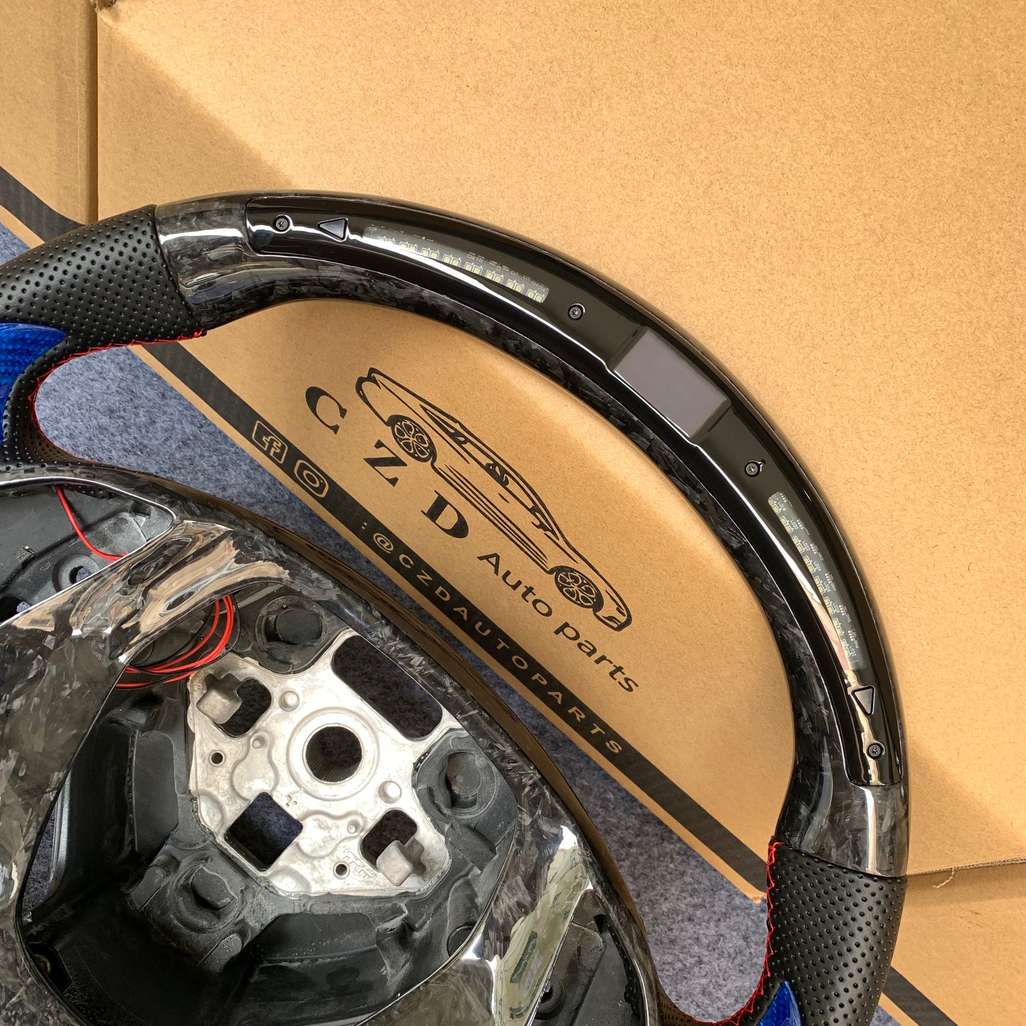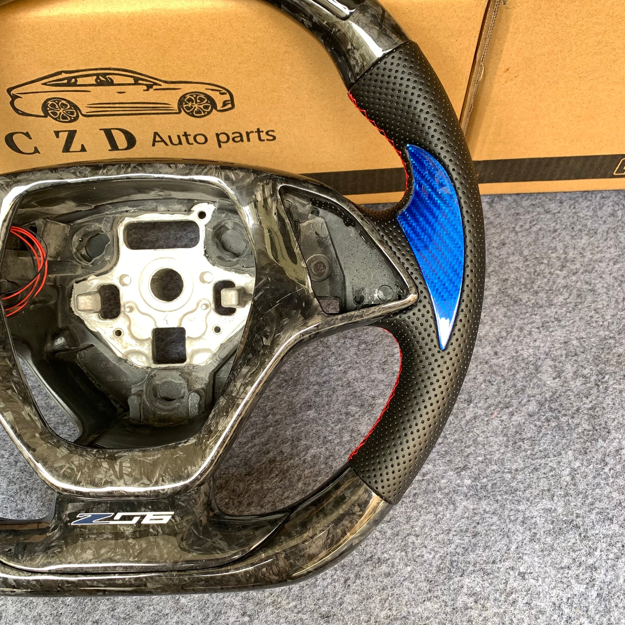 CZD autoparts for Chevrolet Corvette C7 2014-2019 carbon fiber steering wheel with gloss blue thumb grips