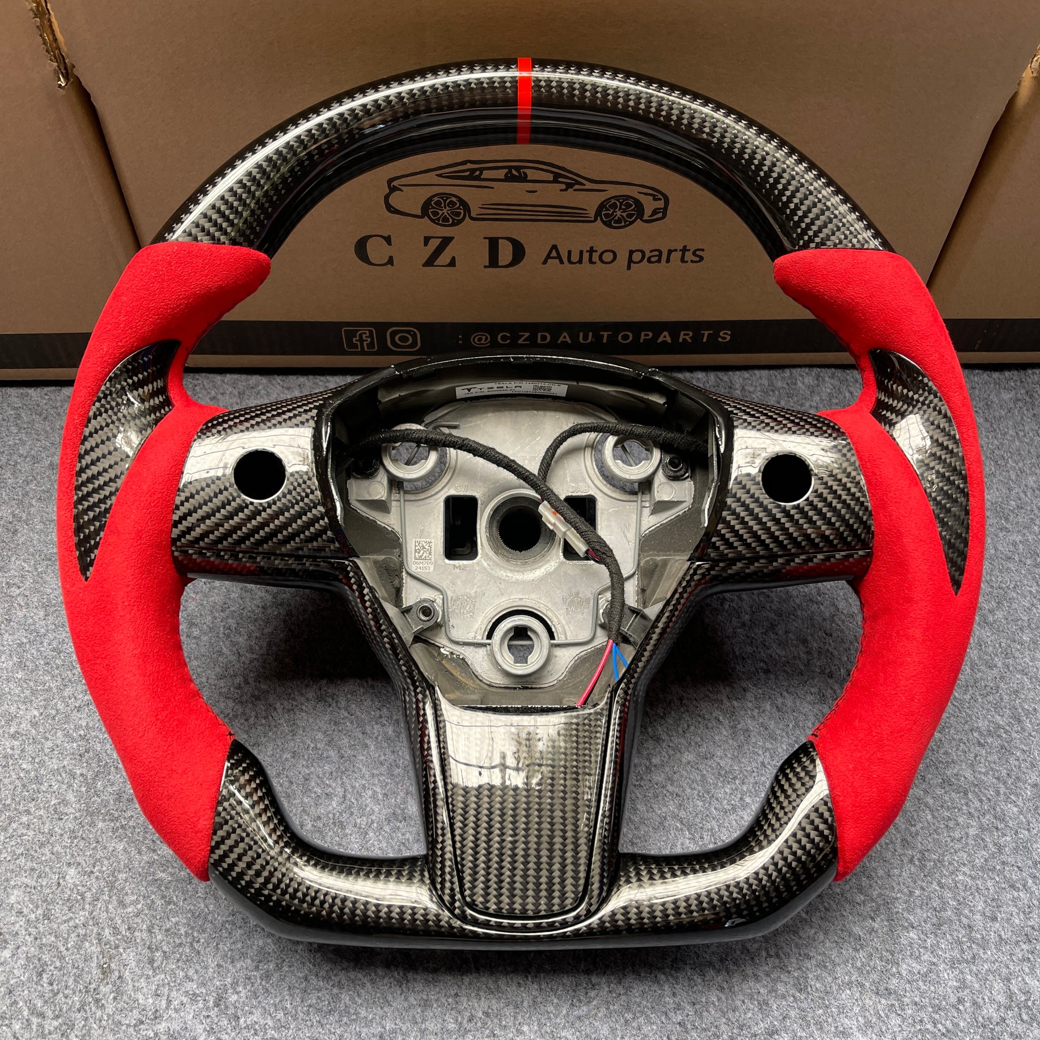 CZD auto parts for Tesla Model 3 2017-2020 carbon fiber steering wheel with red alcantara leather side