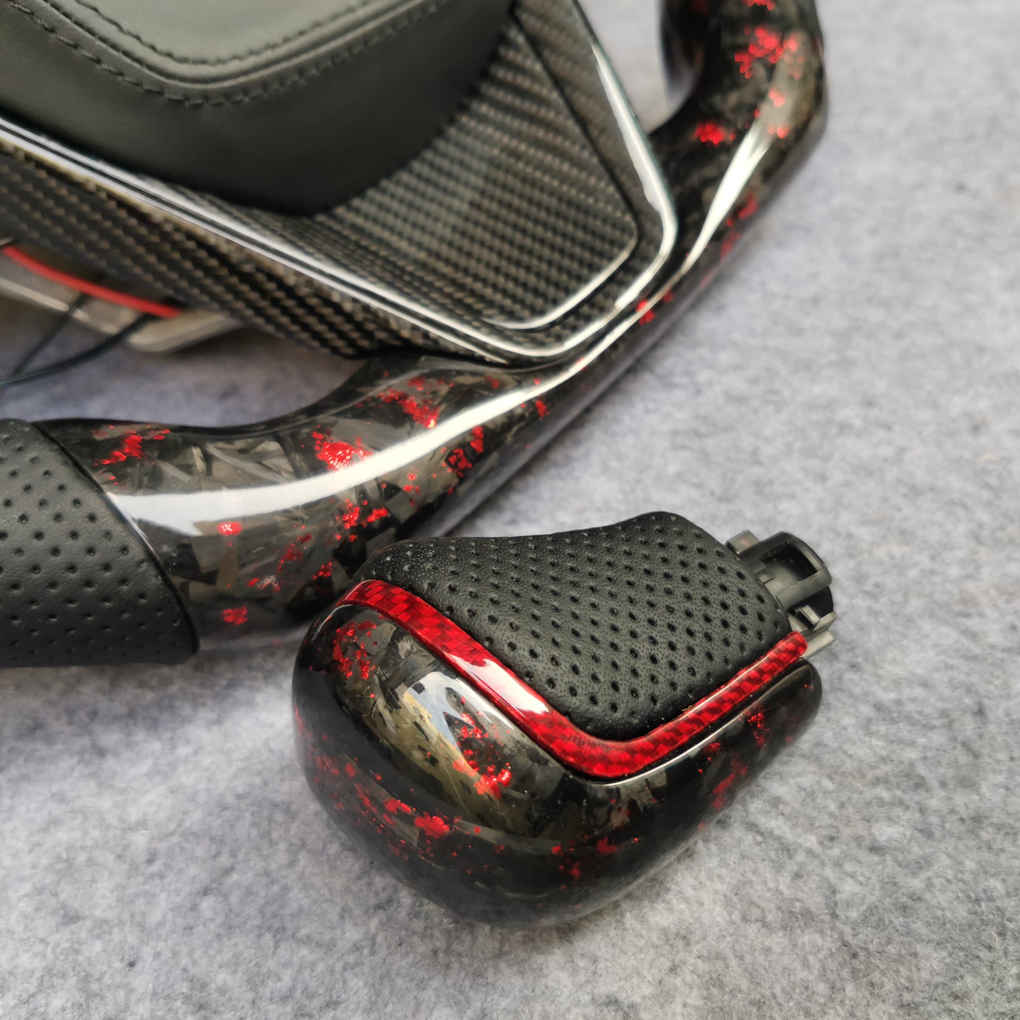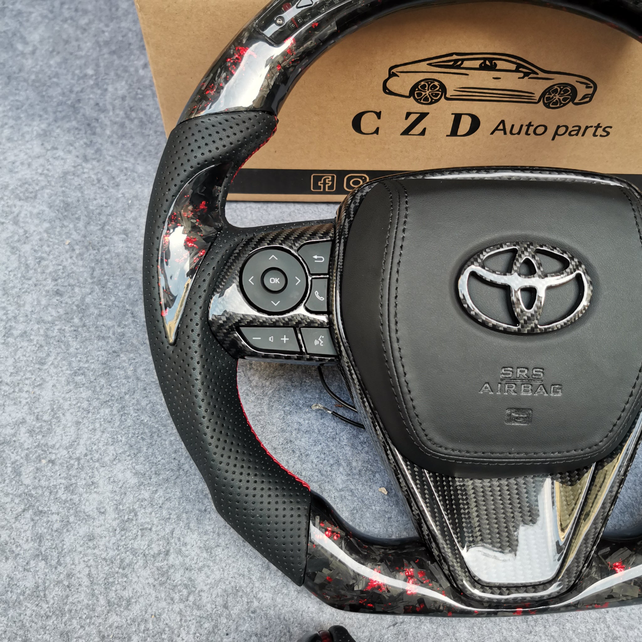 CZD Autoparts for Toyota Avalon 2018-2022 carbon fiber steering wheel gloss carbon fiber with red flakes top and bottom and black alcantara sides